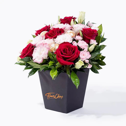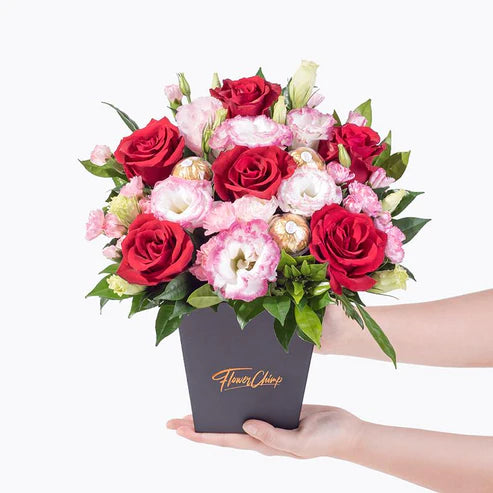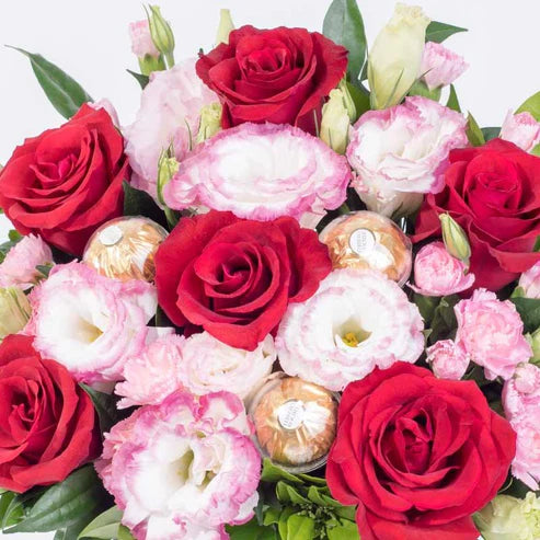 Red Roses (6 Stalks), Two-toned Pink Eustoma (2 Stalks), Pink Carnation Spray (2 Stalks), Ferrero Rocher (3 Stalks)