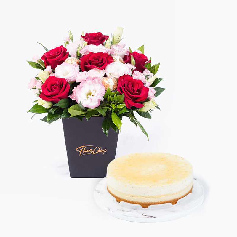 Our Starlight flower arrangement dazzles in shades of effervescent indigo and purple, with petals of roses, eustomas, and eucalyptus baby blue. Our zinging Lemon and Yuzu Cheesecake - a burst of colour upon flavour, compliments our beautiful bouquet in the most exuberant way.