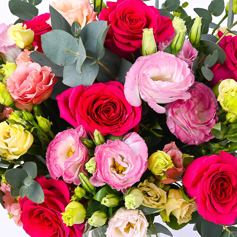 Light Pink Alstromeria (3 stalks), Pink Lily (2 stalks), Red Rose (12 stalks), Eucalyptus Leaves