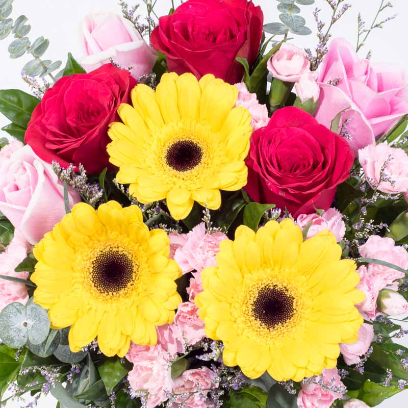 Red Roses (3 Stalks), Maria Pink Roses (3 Stalks), Yellow Gerberas (3 Stalks), Light Pink Carnation Spray (2 Stalks), Purple Caspia, Eucalyptus Leaves