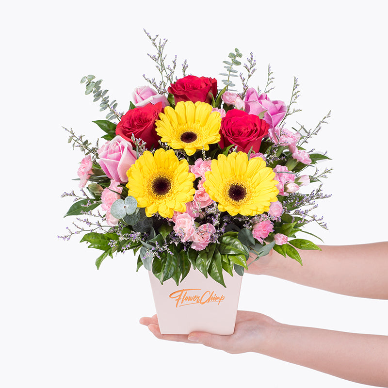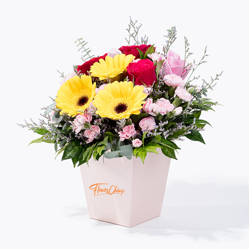 The perfect box of fresh flowers that represents your love or friendship. - This gift comes with an arrangement of red roses, maria pink roses, yellow gerberas, and light pink carnation sprays. A stunner that will brighten the atmosphere of the room while putting a smile on your loved one's face.