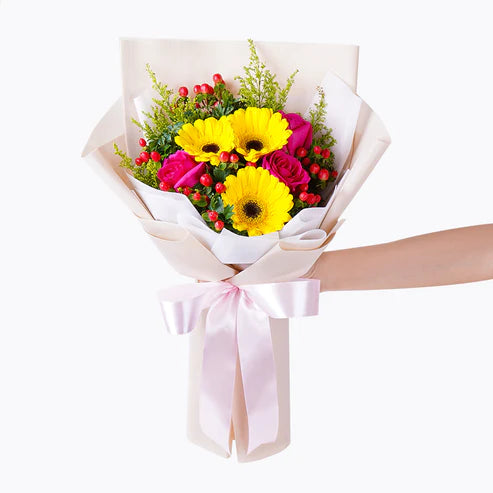 Red Berry (2 Stalks), Yellow Gerbera (3 Stalks), Dark Pink Rose (3 Stalks)