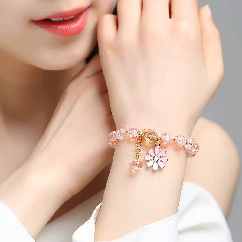 Blushed pink glass beads, arranged together with a lovely little daisy charm. Our Bubblegum Daisy Bracelet is a truly heartfelt add-on to your gift - a charming jewellery piece to remind her of you wherever she goes.