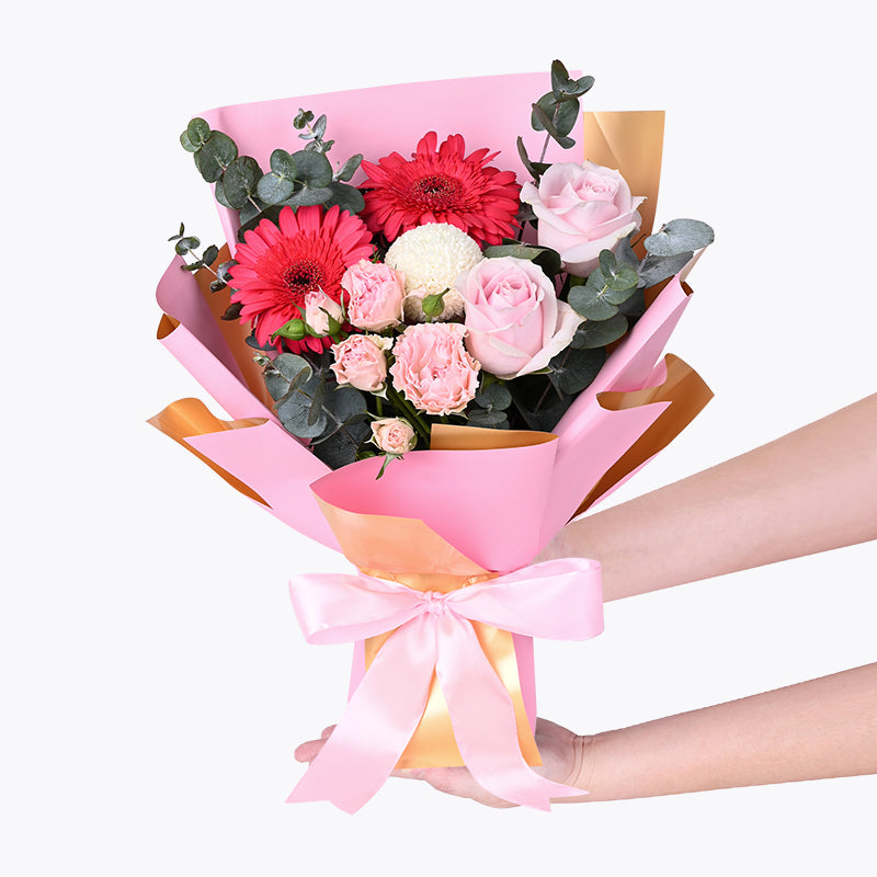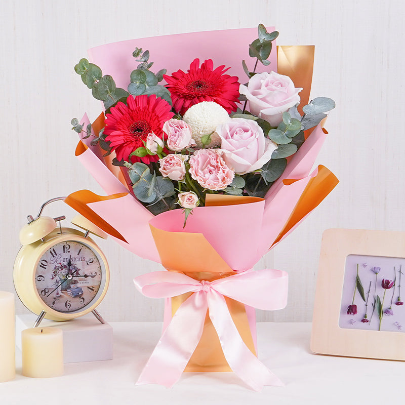 Pops of pink roses and gerberas, paired together with pristine white ping pong blooms. Perfect for celebrating the most special people & most momentous celebrations of life, our Carissa flower bouquet is an expression of care & warm wishes - straight from the heart.