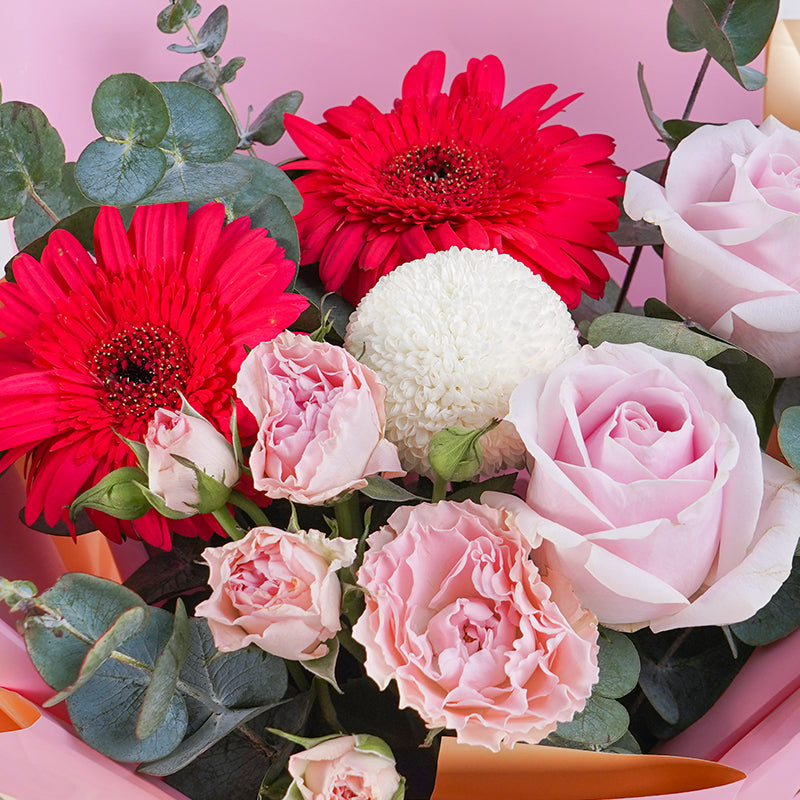 Gerbera Shocking Pink (2 stalks), Ping Pong White (1 stalk), Avalanche Pink Rose (2 stalk), Pink Rose Spray (1 stalk), Eucalyptus Cinerea
