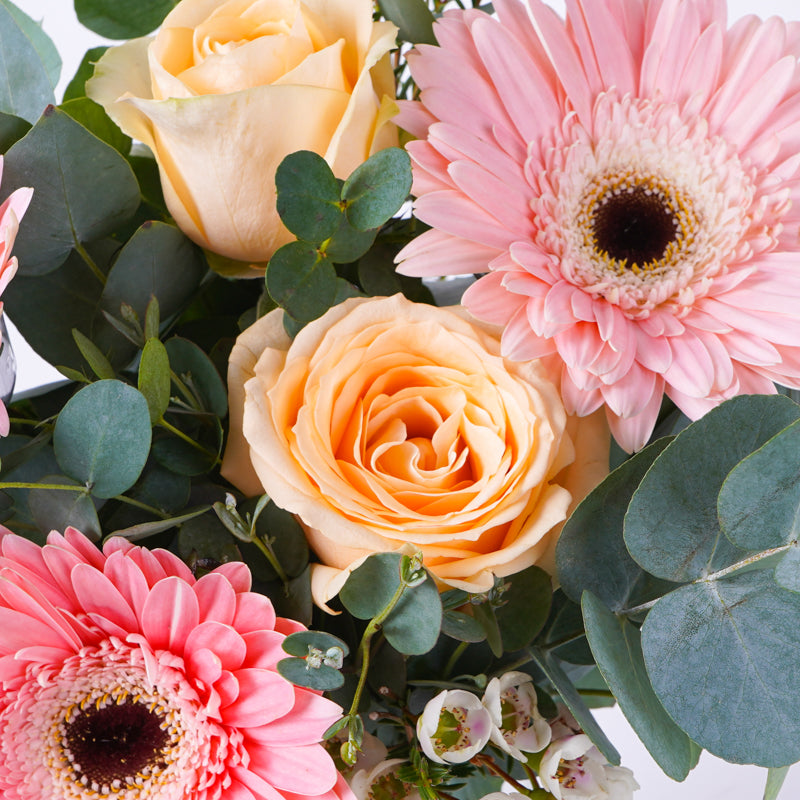 Red Gerbera (2 Stalks), Red Carnation (2 Stalks), Green Trick (3 Stalks), Red Berry (1 Stalk), Cinerea Eucalyptus, Nobilis Fir