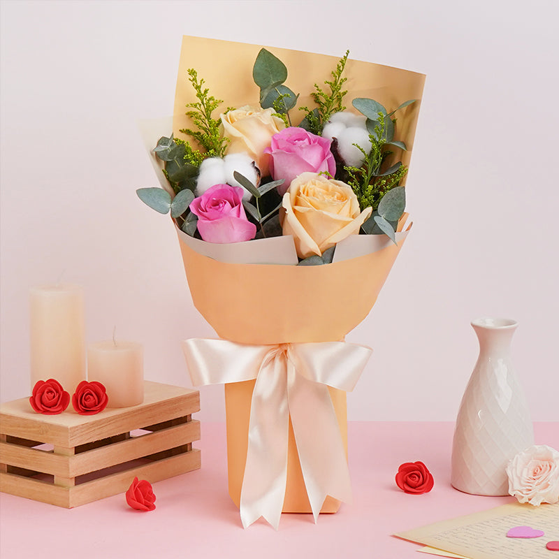Transport your special someone to a land full of pure romance, with soft pink and champagne roses & pops of white cotton flower. Make their Valentine's Day a dream come true, with our sweet and salubrious Cloud Nine flower bouquet, handcrafted to make your love bloom.