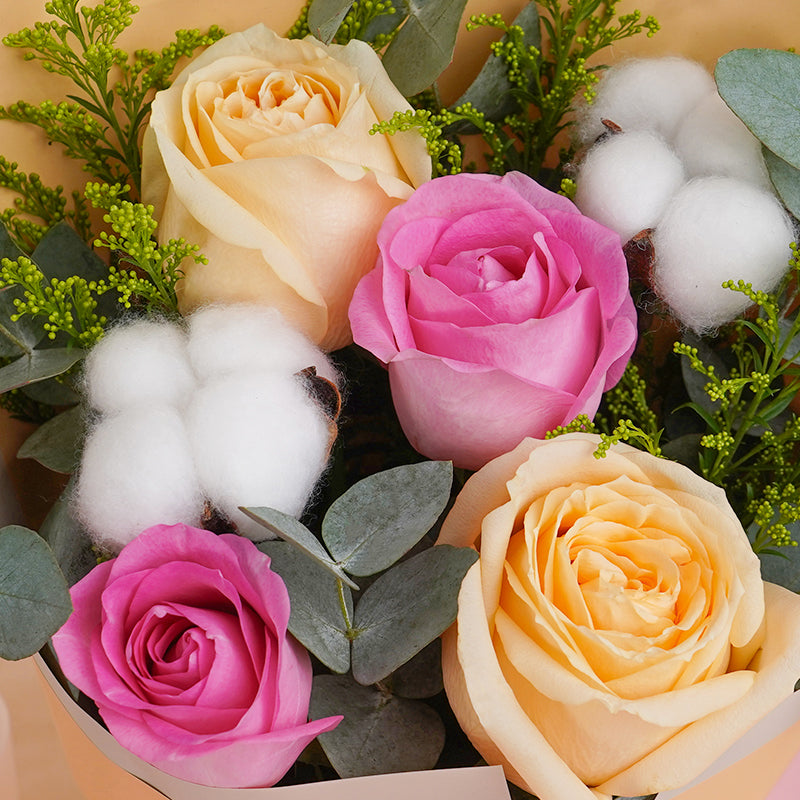 Champagne Rose (2 stalks), Cherry Pink Rose (2 stalks), Cotton Flower (2 stalks), Yellow Peacock, Eucalyptus Leaves