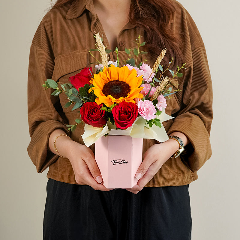 Can a sunflower ever fail to make anyone smile? We think not! Our 'Come Together' mini bouquet has a bright sunflower in the middle to brighten up anyone's day, with elegant red roses accompanying it to express your true love. Have this bouquet as a surprise gift, and you can be sure that they will appreciate your lovely gesture!
