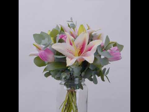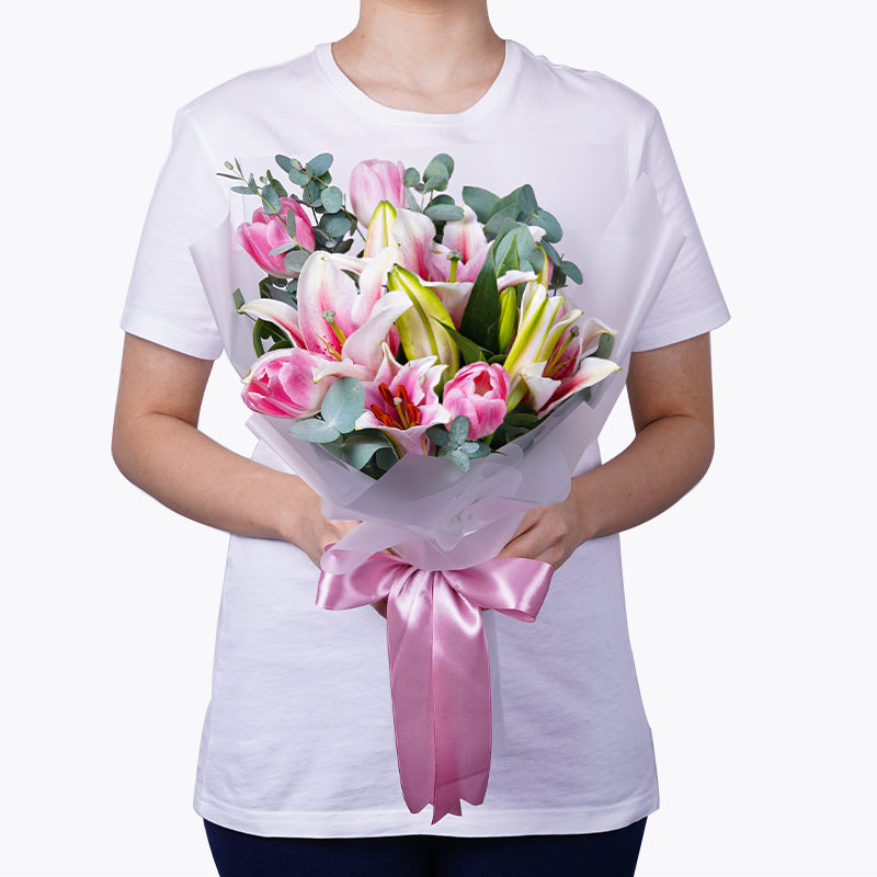 Pink Lily (2 Stalks), Pink Tulips (5 Stalks), Eucalyptus Leaves