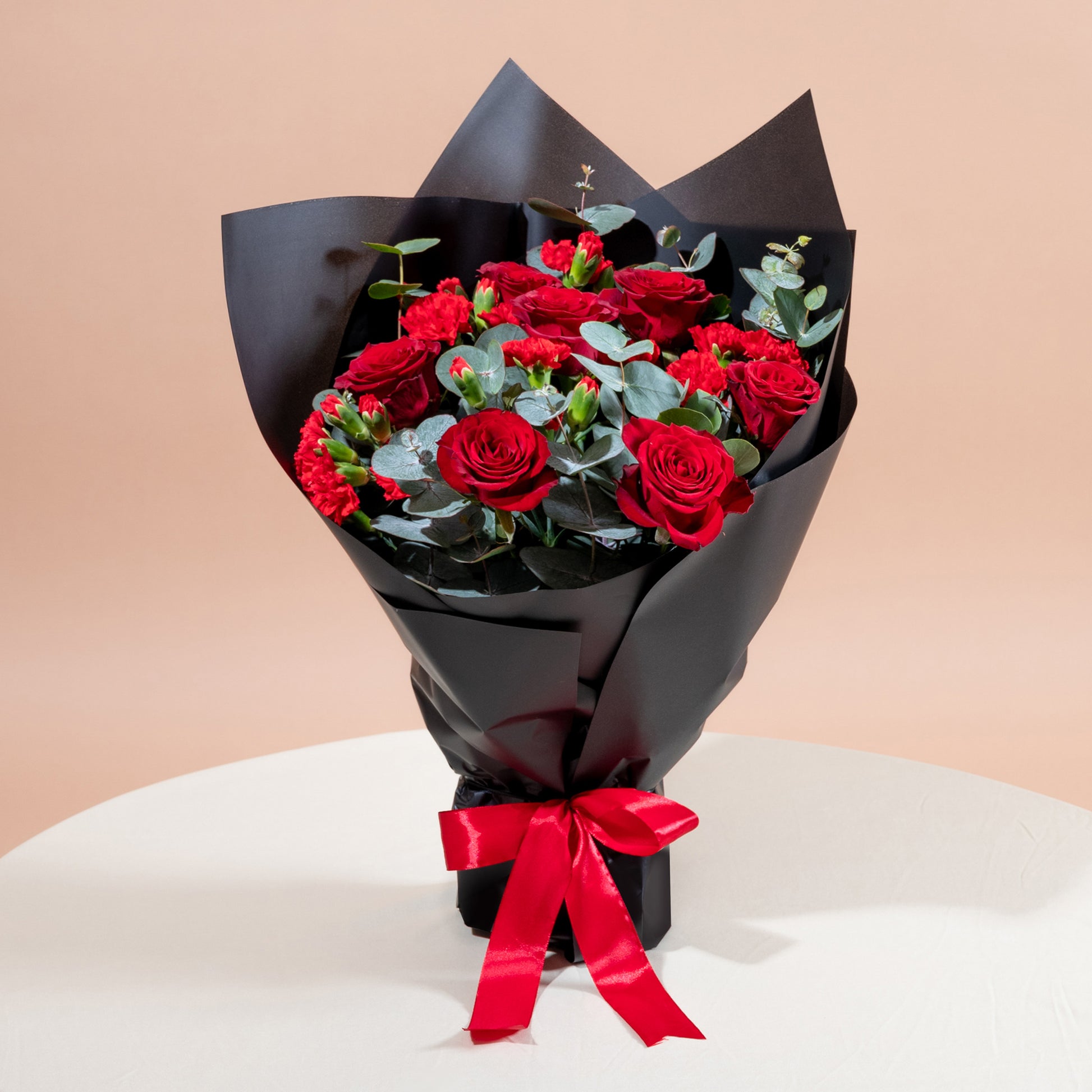 Red Roses (7 stalks), Red Carnation Spray (5 Stalks), Eucalyptus Leave