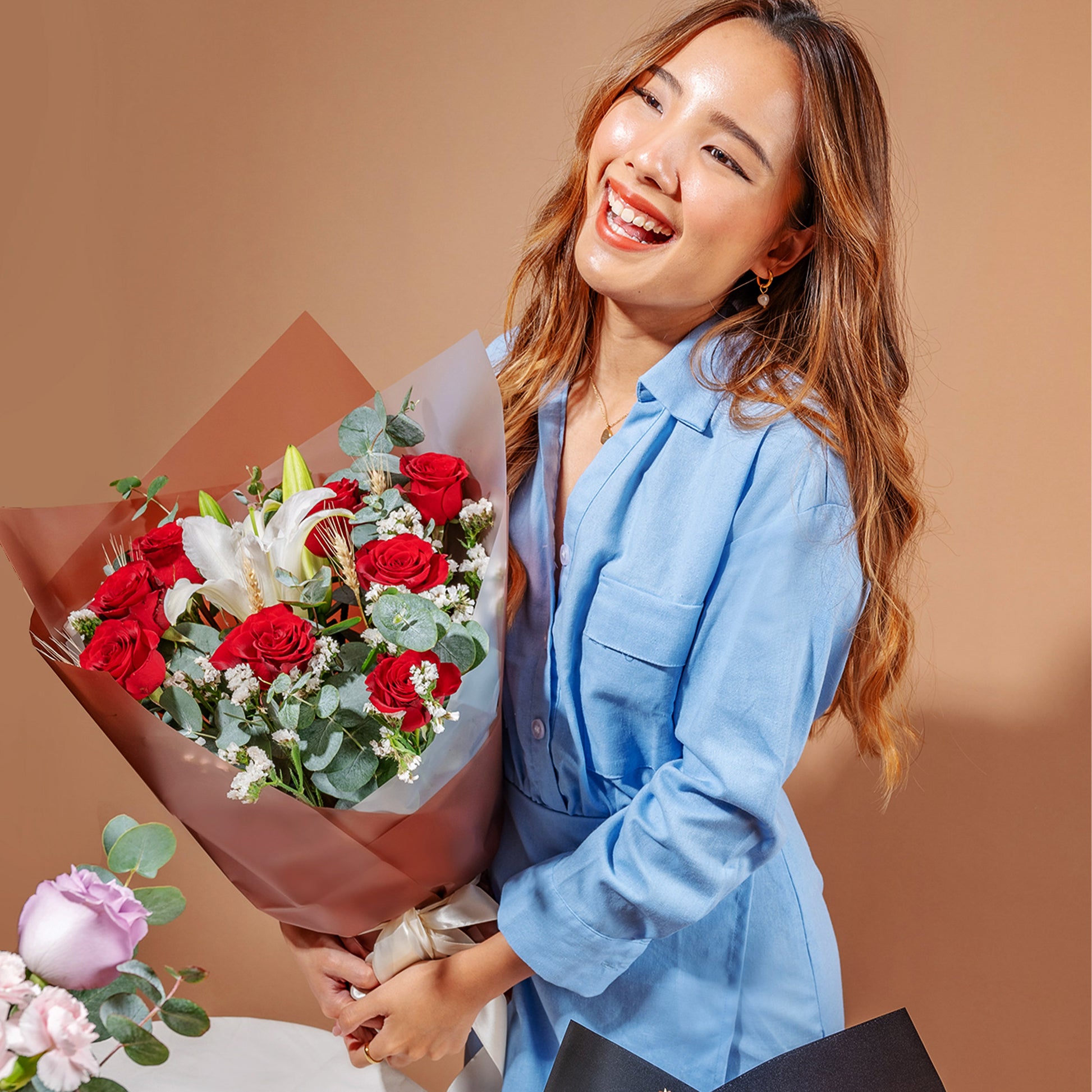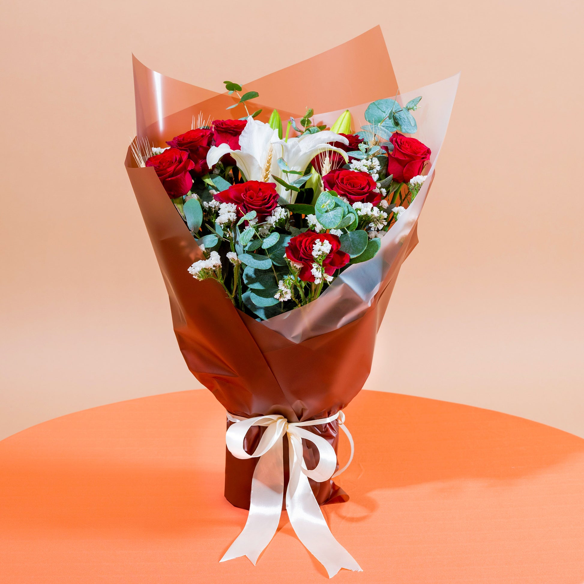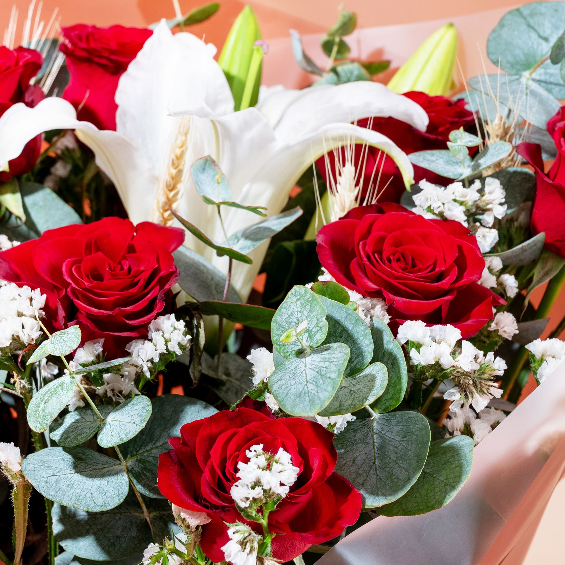 White Lily (1 Stalk), Red Rose (8 Stalks), Brown Dried Wheat Natural (5 Stalks), White Statice (3 Stalks), Cinerea Eucalyptus