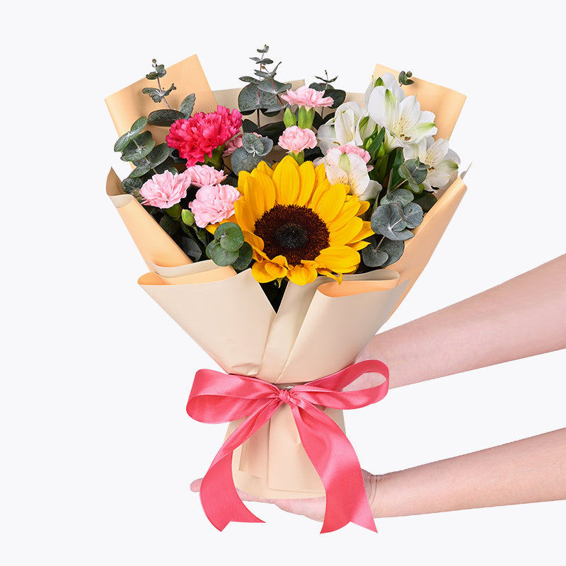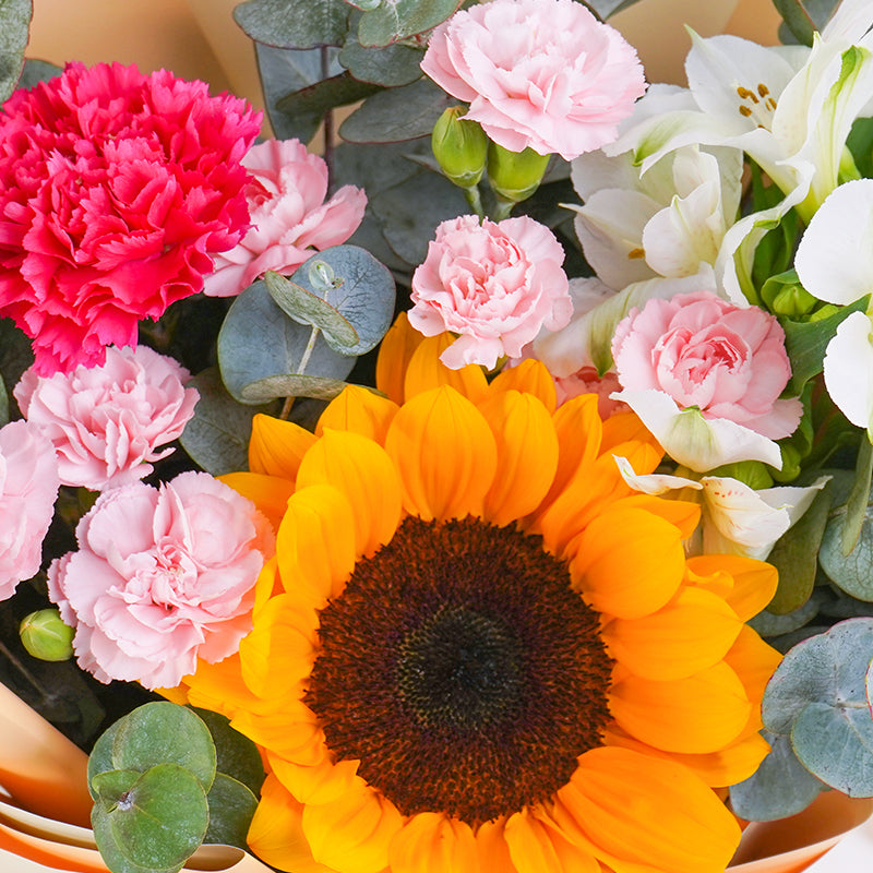 Sunflower (1 stalk), Carnation Spray Pink (2 stalks), Shocking Pink Carnation (1 stalk), Alstroemeria White (1 stalk), Eucalyptus Cinerea