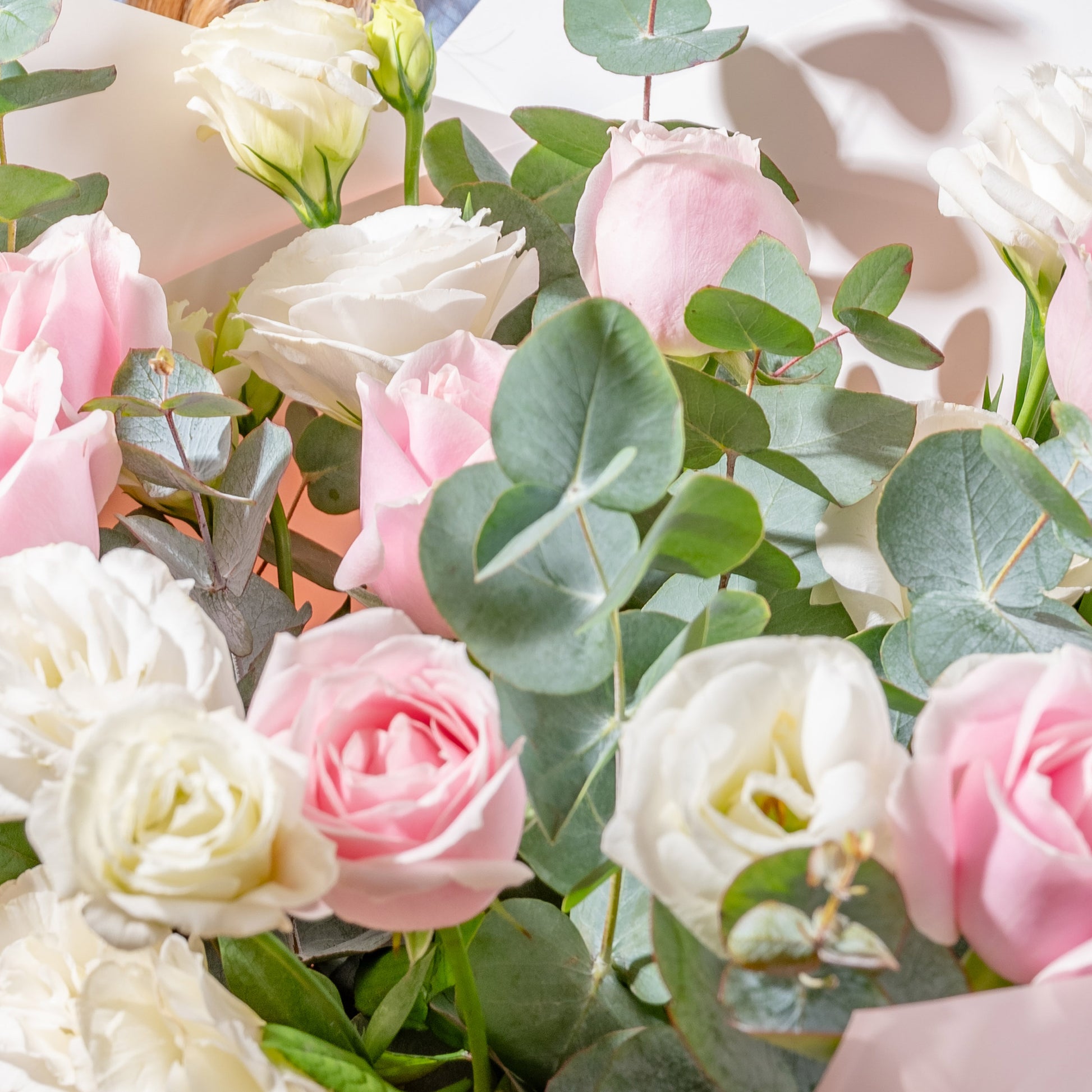 Light Pink Roses (7 stalks), White Eustoma (4 Stalks), Eucalyptus Leaves