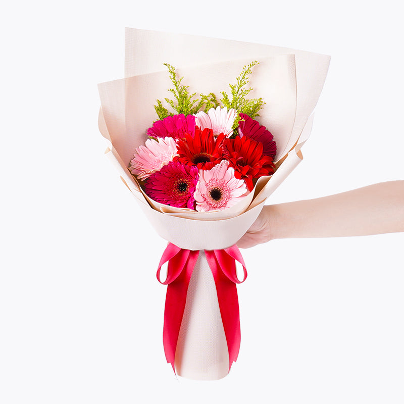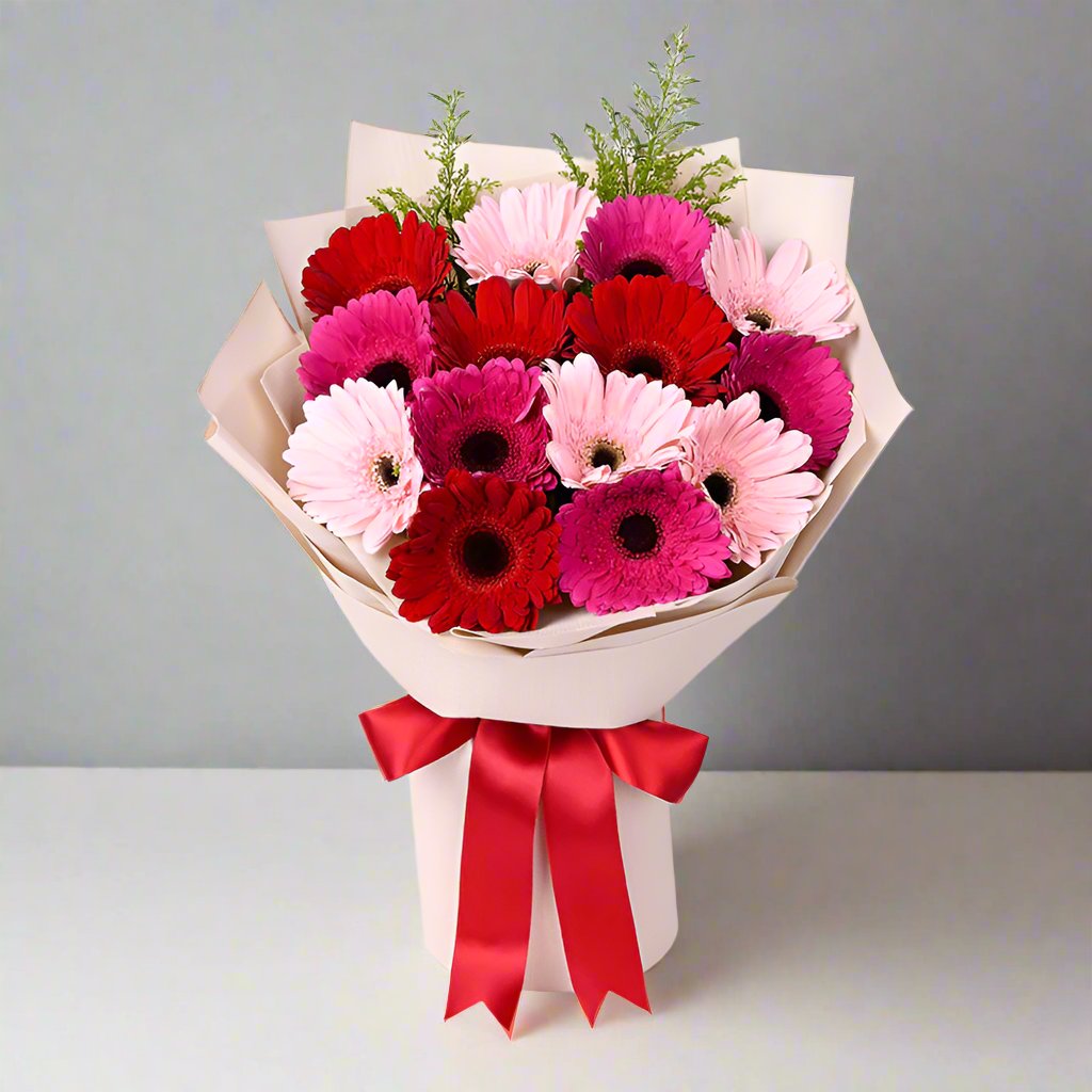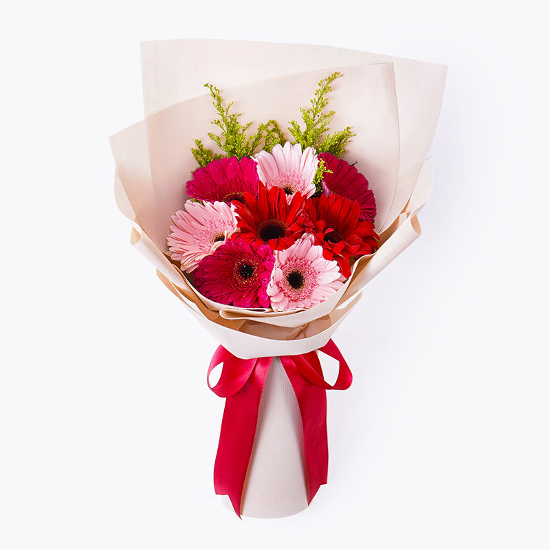 A bright bouquet decked with light pink gerberas, shocking pink gerberas, and red gerberas. Surely to put a smile on someone's face upon receiving this wonderful gift!
