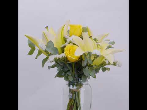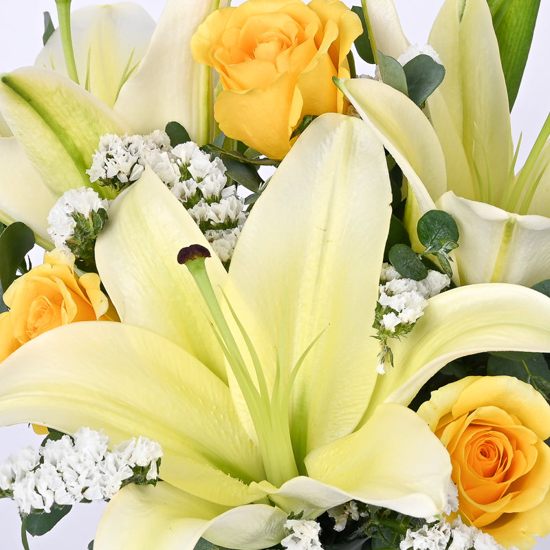 Yellow Lily (1 Stalk), Yellow Rose (3 Stalks), White Statice (1 Stalk), Eucalyptus Leaves