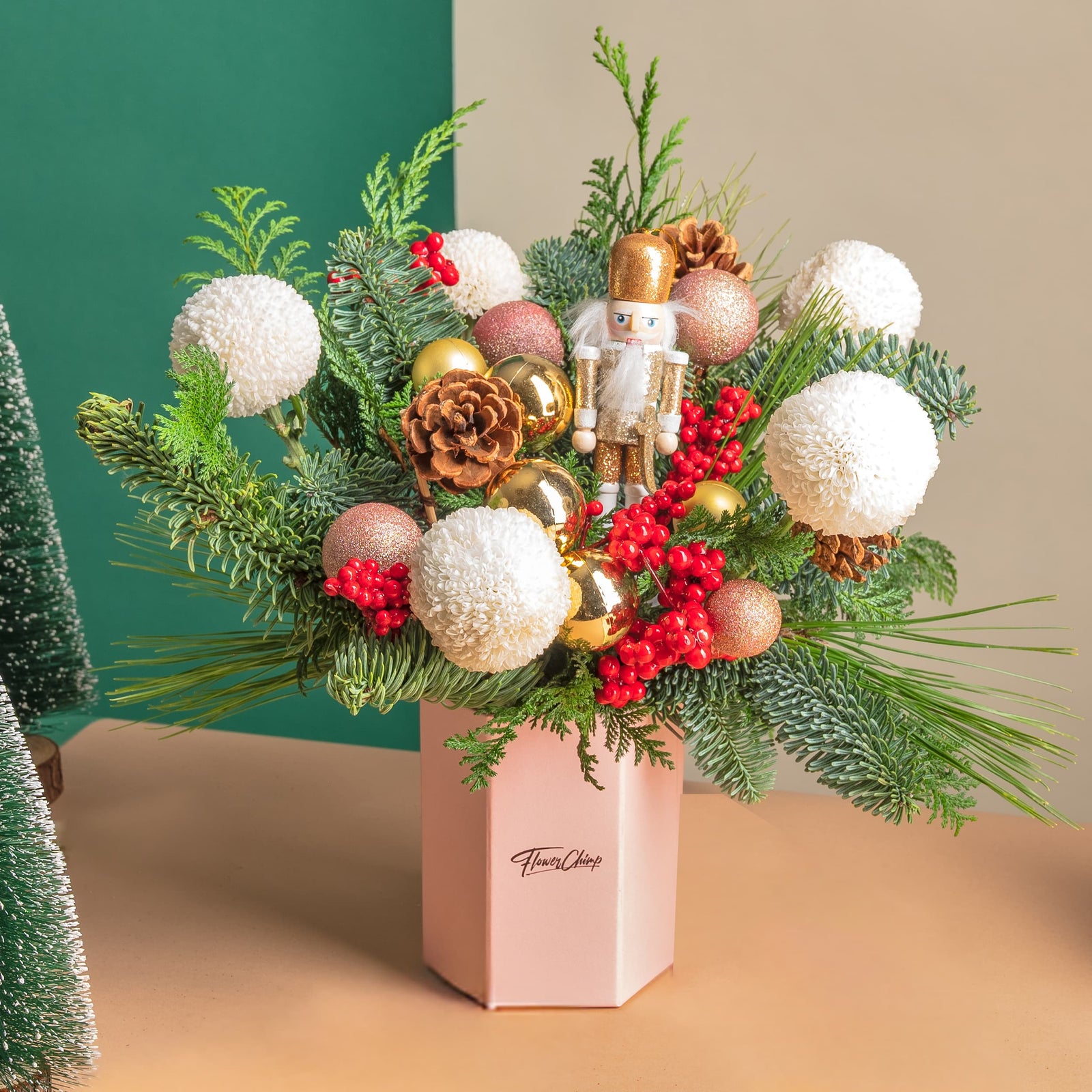 Frosty's Pine is not your average arrangement; it's a snowman party in a box! With a pristine white rose, soft pom and ping pongs, and adorable snowman-inspired details, this mini hexagon box brings a playful and fun touch to your holiday celebrations. Unwrap the cuteness and share the festive joy with Frosty's Pine!
