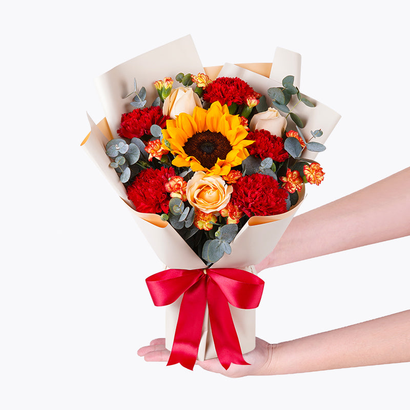 Sunflower (1 Stalk), Red Carnation (5 Stalks), Champagne Roses (3 Stalks), Two-toned Orange Carnation Spray (3 Stalks), Eucalyptus Leaves