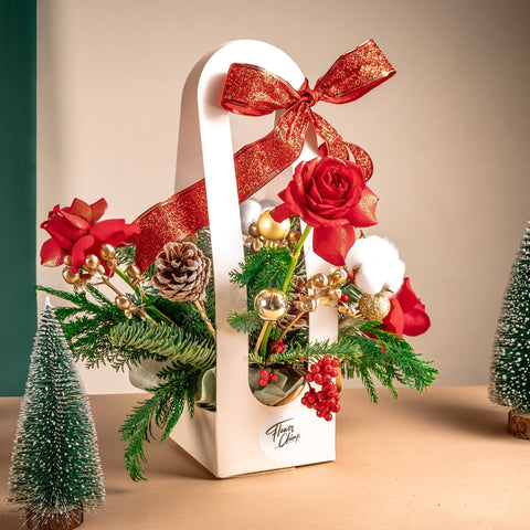 Festive sophistication shines through in this gorgeous hand-held treasure that captures the essence of Christmas elegance! Stunning red roses take center stage alongside vibrant red berries, rustic pine cones, and lush winter greenery, creating a refined celebration of the season. Adorned with sparkling golden ornaments and twinkling fairy lights that add enchanting glow, this stylish memento embodies the magic of the holidays with graceful charm and timeless festive beauty.