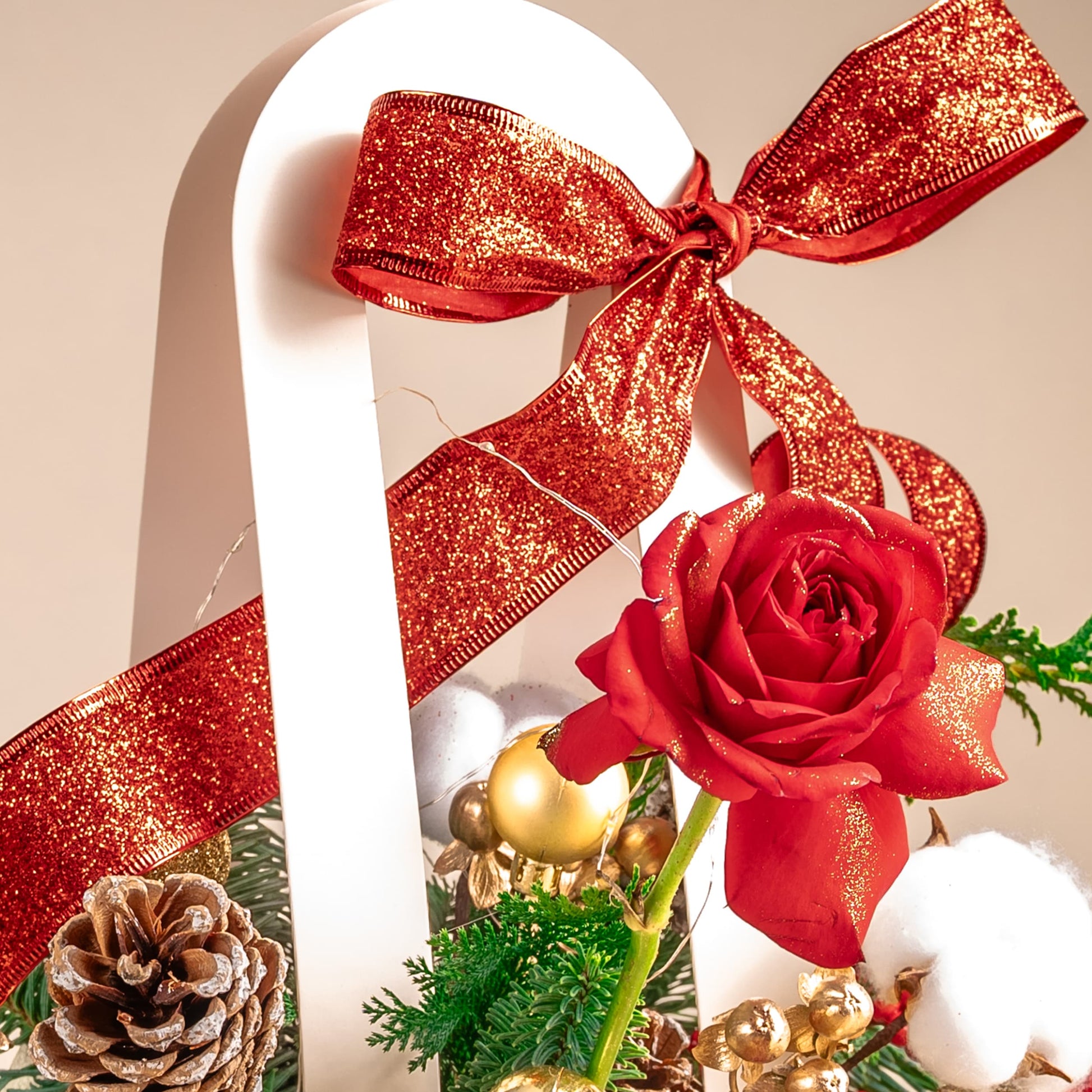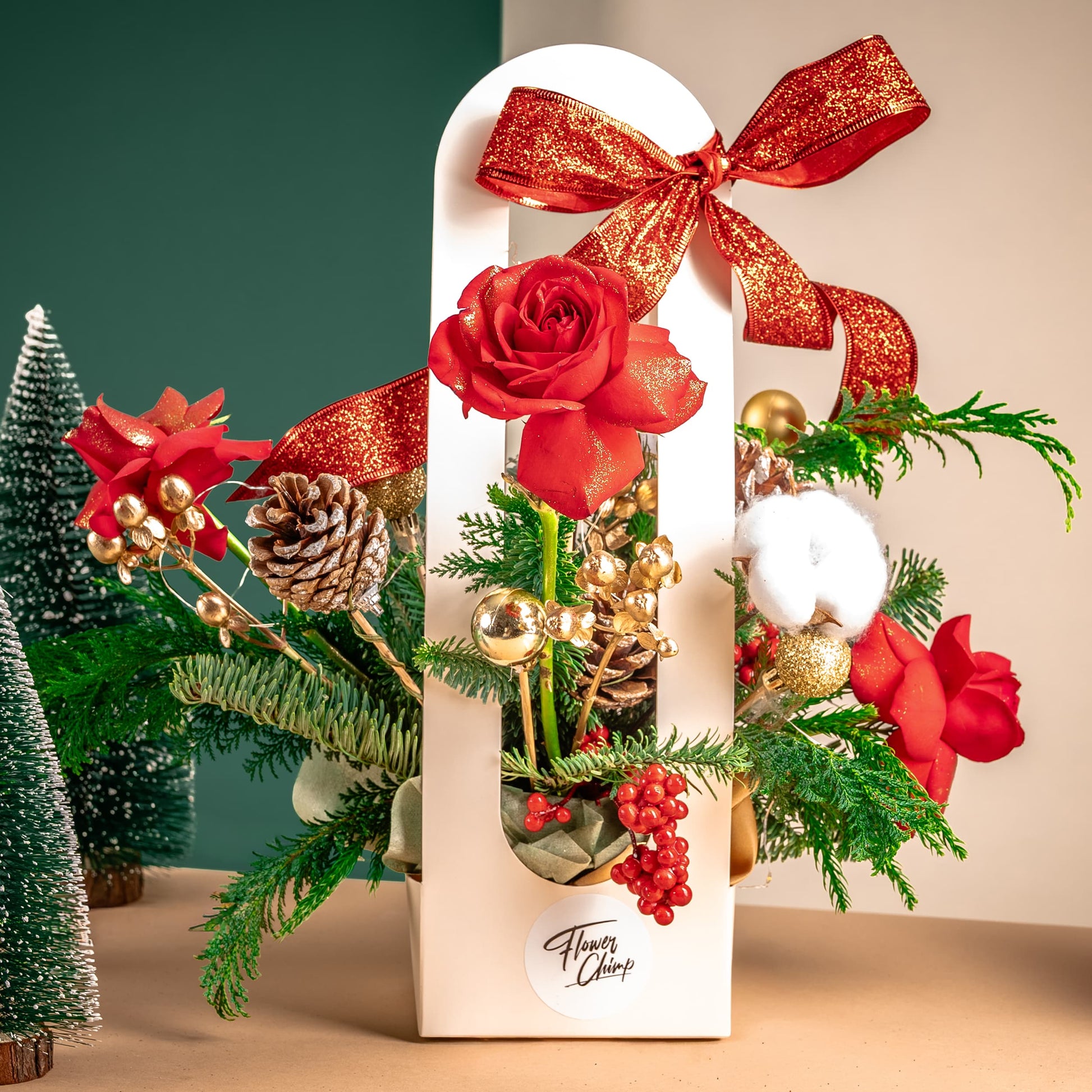 Red Rose (3 Stalks), Red Berry (2 Stalks), Pine Cones (3 Stalks), Red Artificial Ilex Small (1 Stalk), Christmas Leaf, Pinus Morrisonicola
