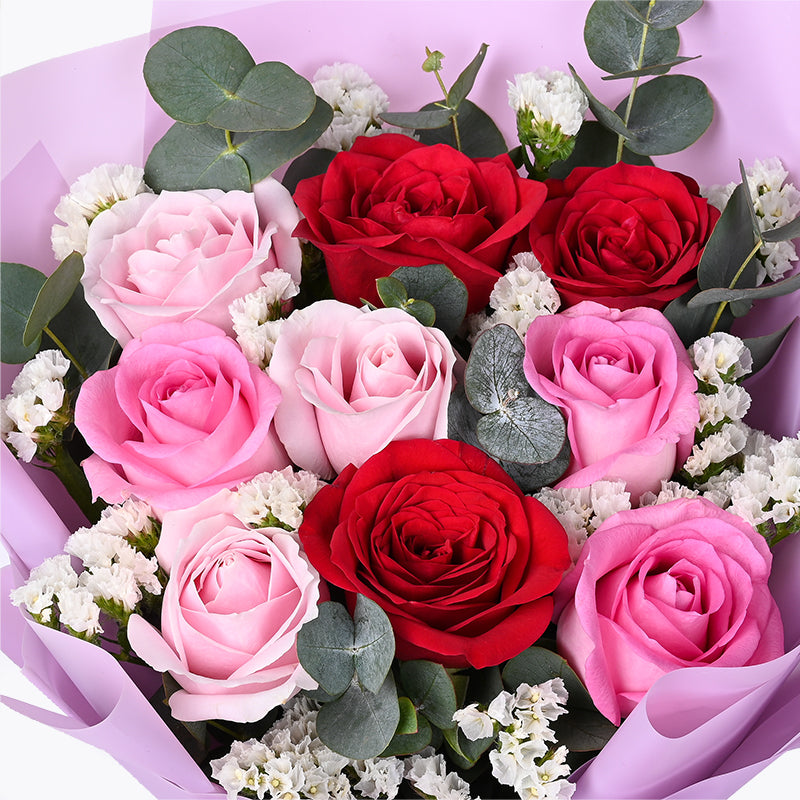 Premium: Red Roses (4 stalks), Light Pink Roses (4 stalks), Cherry Pink Roses (4 stalks), White Statices (3 stalks), Eucalyptus Leaves
