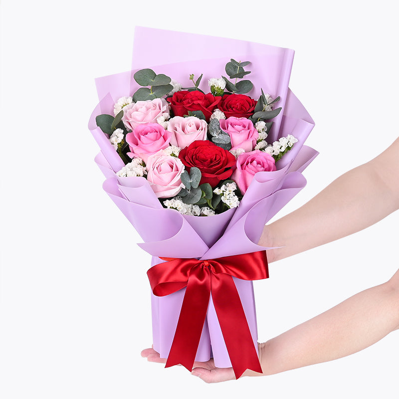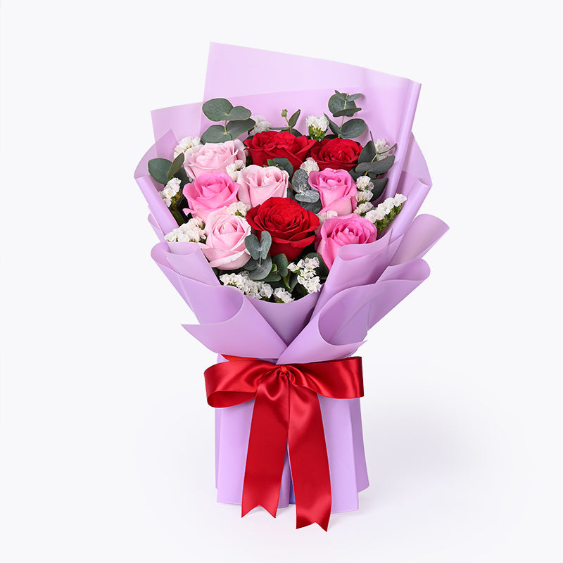 Standard: Red Roses (3 stalks), Light Pink Roses (3 stalks), Cherry Pink Roses (3 stalks), White Statices (2 stalks), Eucalyptus Leaves