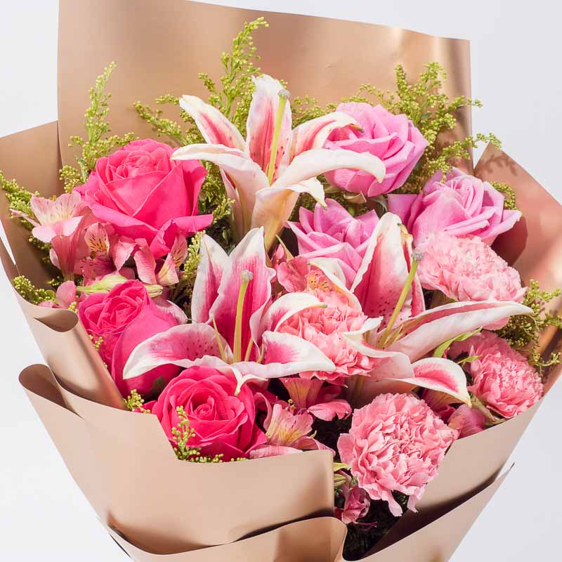 Pink Alstroemeria (4 Stalks), Light Pink Carnation (4 Stalks), Pink Lily (1 Stalk), Maria Pink Rose (3 Stalks),ShockingPink Rose (3 Stalks), Gold Peacock