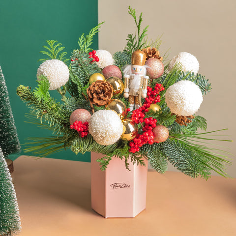 Watch the magic of Christmas come alive in this adorable flower box! Our Nutcracker Magic features fluffy white ping pong blooms that look just like perfect snowballs, accented with festive red berries, rustic pine cones, and lush winter greenery. A charming miniature nutcracker stands guard over this cute arrangement, joined by golden ornaments that add a touch of sparkle. This enchanting box captures all the wonder and whimsy of the holiday season, making it the perfect gift for bringing Christmas joy to someone special!