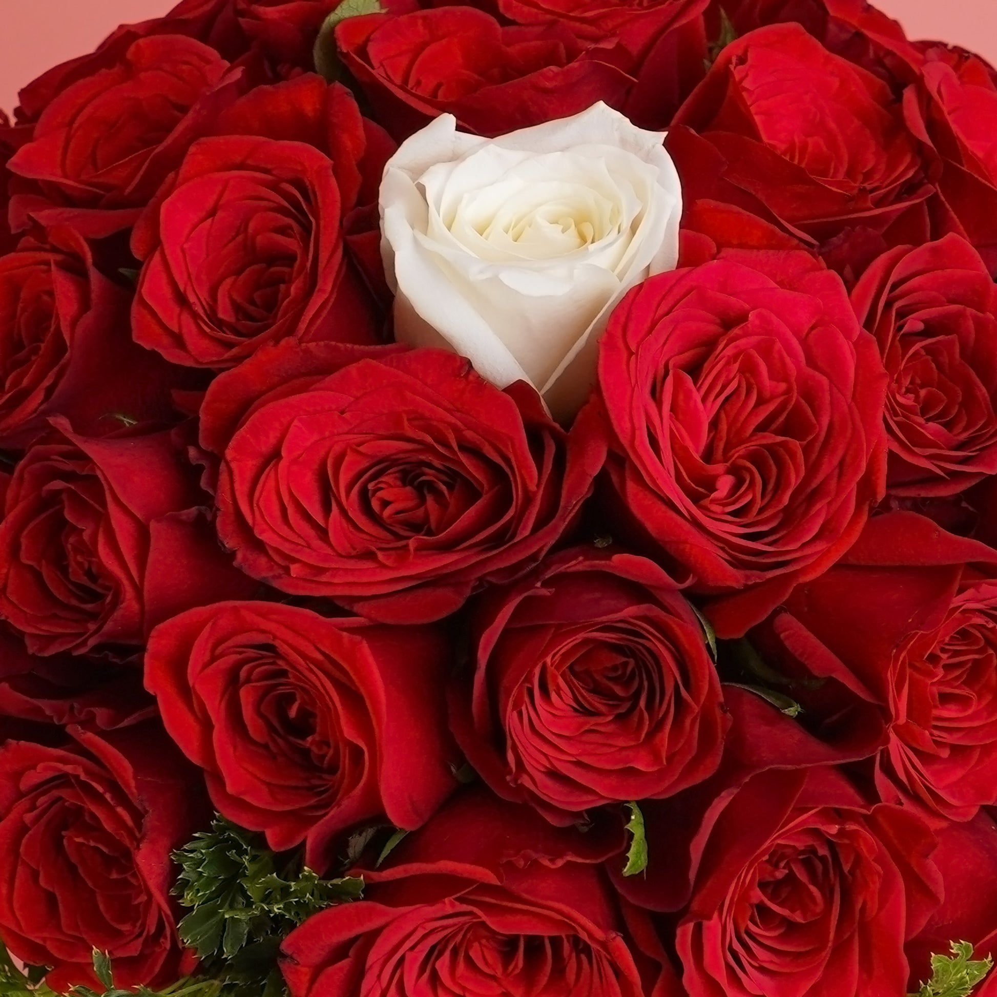 There is so much beauty in this world, but you are my only one - The single white rose, surrounded by 49 lush red roses, is a wonderful statement to express how unique and important someone is. A great gesture for a romantic occasion such as an anniversary or the birthday of the loved one.