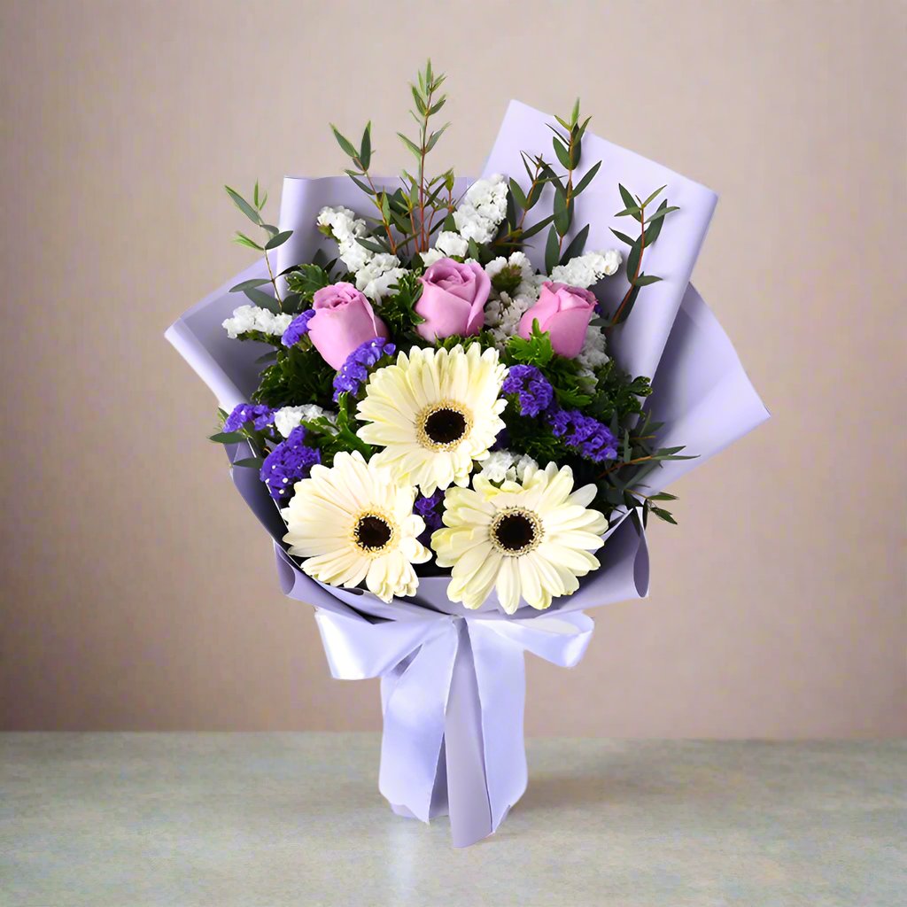 Make your loved ones feel special today with a beautiful purple bouquet that expresses your admiration or sympathy. A sweet bouquet decked with purple roses, white gerberas, dark purple statices, and white statices. - Suitable for all occasions.