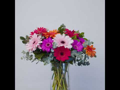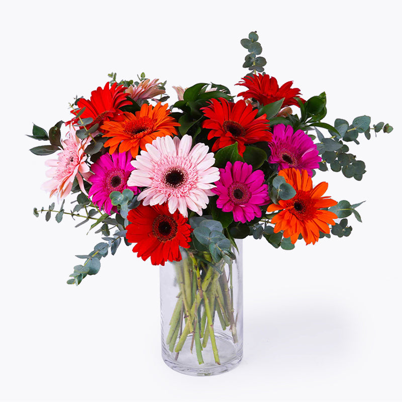 Red Gerbera (4 Stalks), Shocking Pink Gerbera (5 Stalks), Light Pink Gerbera (5 Stalks), Orange Gerbera (3 Stalks), Eucalyptus Leaves