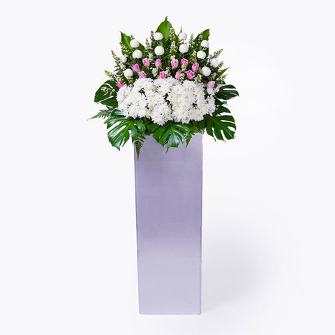 Maria Pink Rose (12 Stalks), White Ping Pong (12 Stalks), White Chrysanthemum (12 Stalks), White Peacock, Green Monstera, Green Rainforest