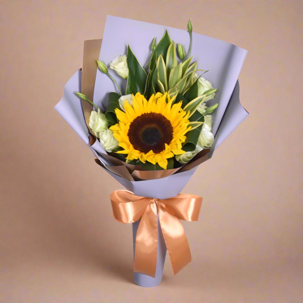 Yellow Sunflower (1 stalk), Green Song of India (2 stalks), Green Eustoma (2 stalks), Green Cordyline (1 stalk)