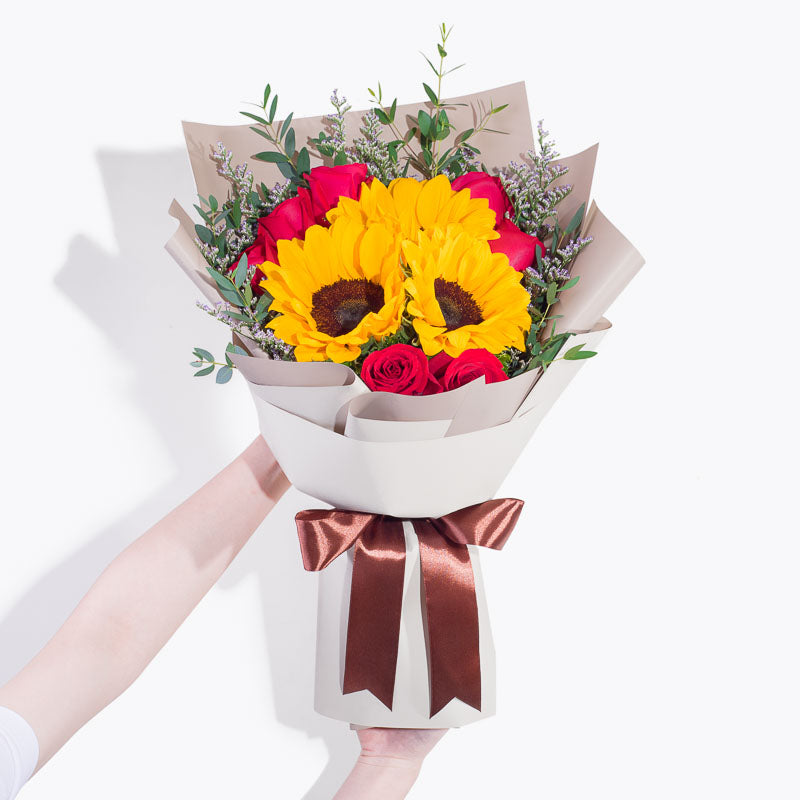 Orange Sunflower (3 Stalks), Yellow Rose (7 Stalks), Green Eustoma (2 Stalks), Green Button Mum