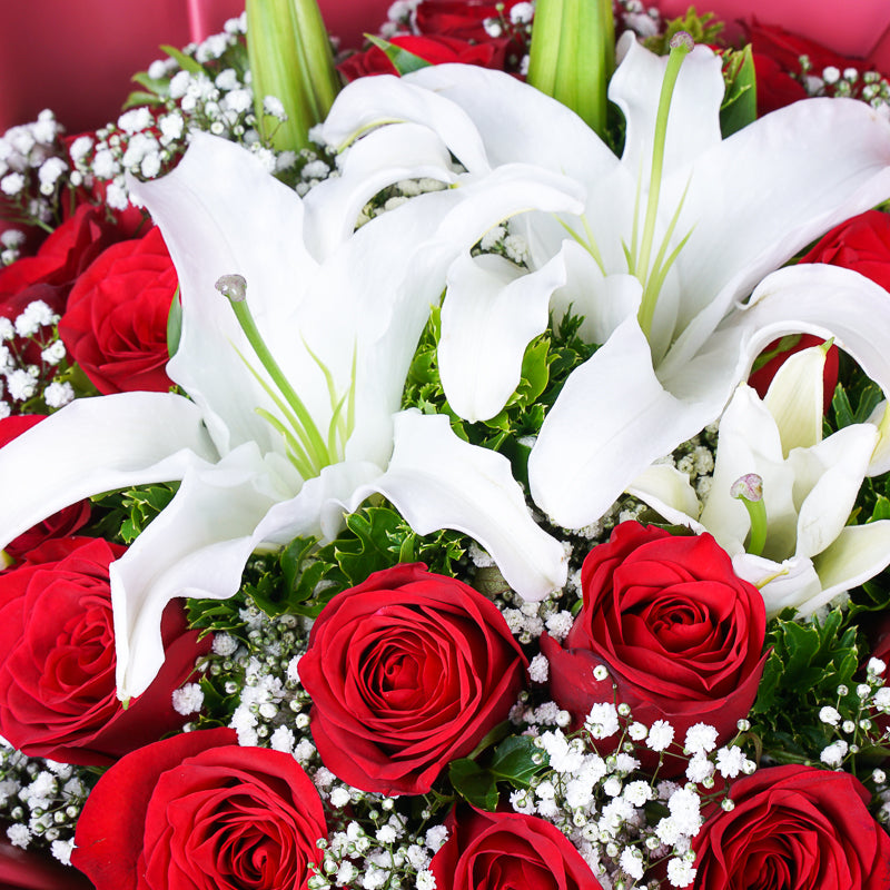 Red Roses (18 Stalks), White Lily (1 Stalk), White Baby Breath