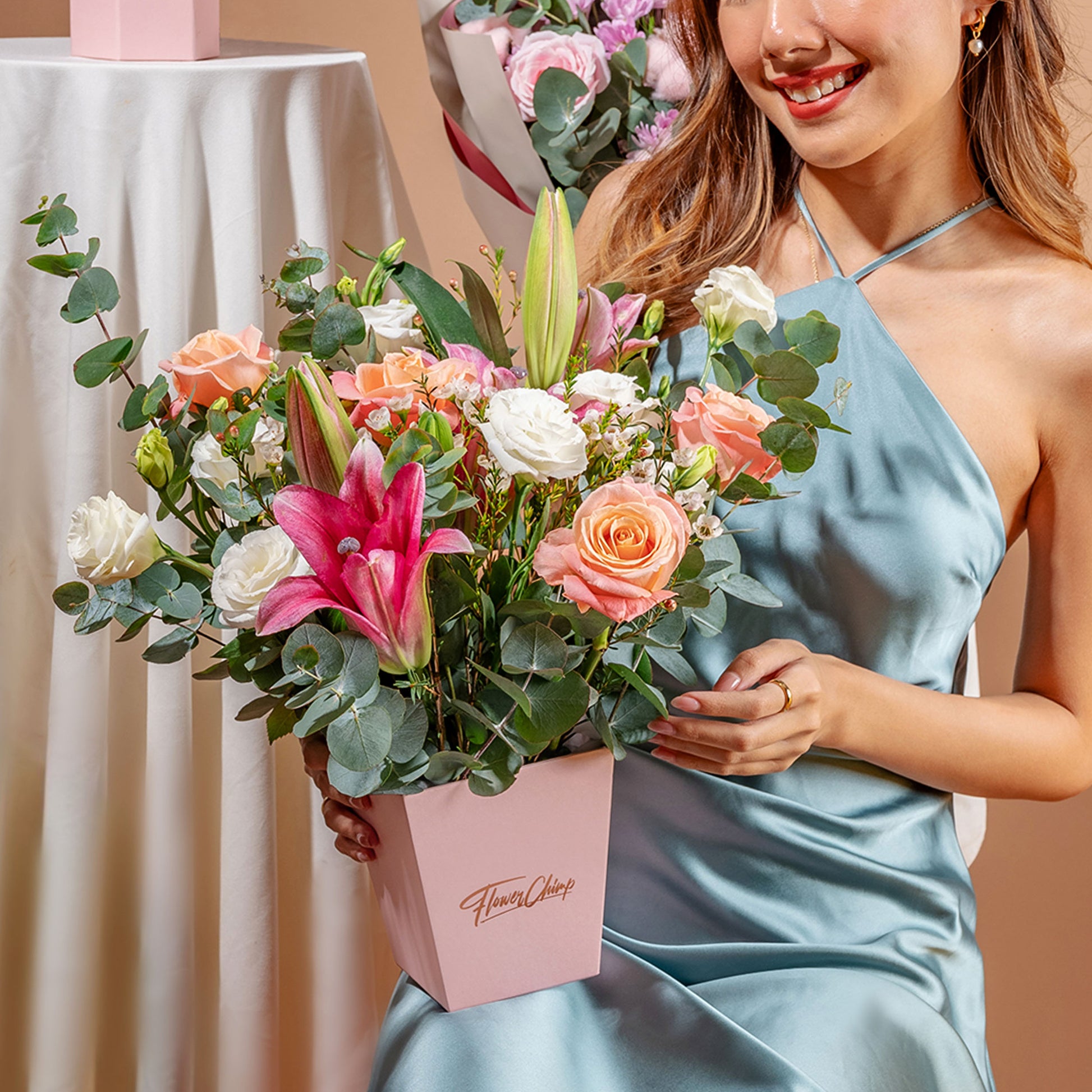 Brighten someone's day with the finest bliss box brimming with the sweetest blossoms - decked with the loveliest lilies, roses, and white eustomas, this fresh flower arrangement is truly the ideal gift when expressing your true love and admiration for your loved one.