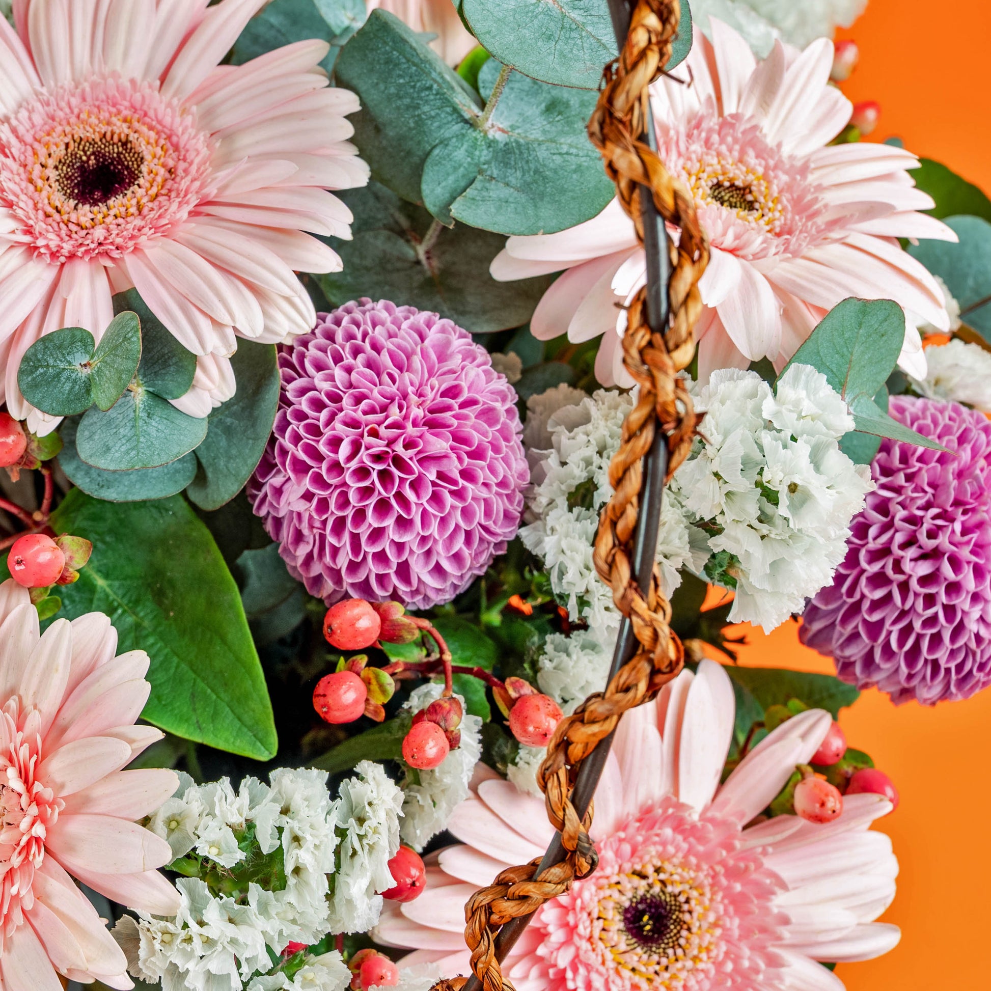 Light Pink Gerbera (5 Stalks), Light Pink Pingpong (3 Stalks), White Statice (1 Stalk), Cinerea Eucalyptus, Red Berry