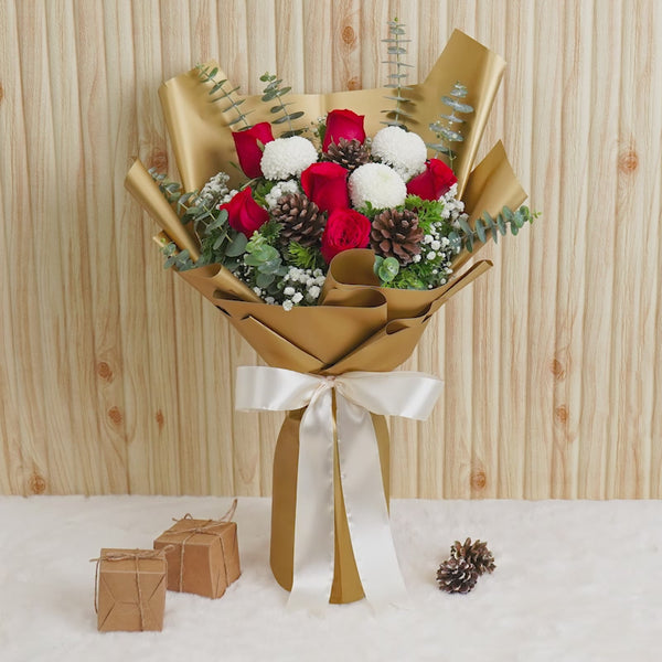 Red Roses (6 Stalks), White Ping Pong (3 Stalks), White Baby Breath, Pine Cone (3 Stalks), Eucalyptus Leaves