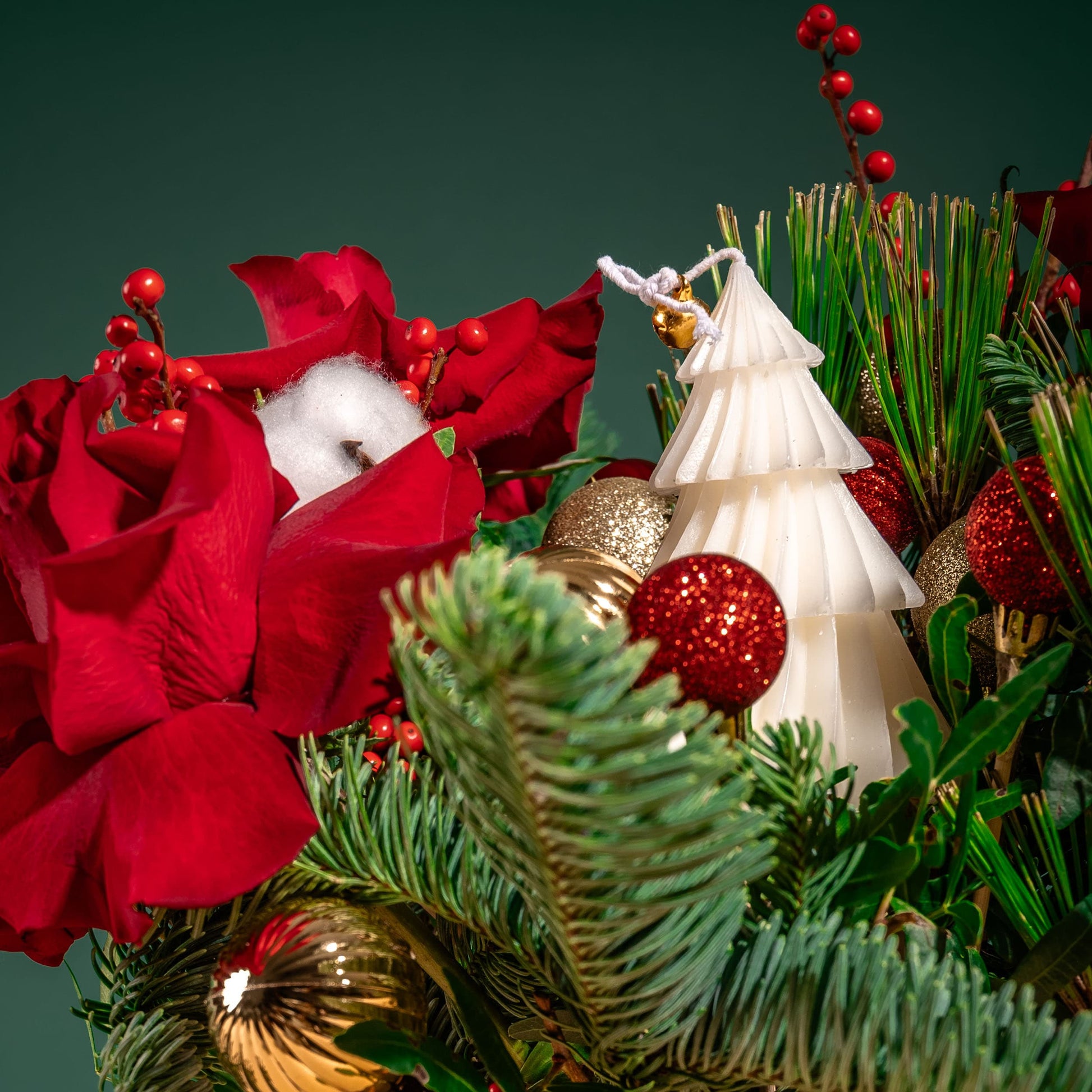 Red Rose (3 Stalks), Red Small Artificial Ilex (1 Stalk), White Cotton Flower (3 Stalks), Nobilis Fir Medium, Pinus Morrisonicola, Green Pistacia